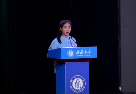 本科生新生代表刘倩颖号召同学们以学为本、知行合一,珍惜在学校的每一寸光阴,用汗水浇灌梦想的种子。