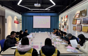发布时间: 2025-12-15 09:22:28 已阅读:为全面掌握联合培养基地的实习培养质量与条件保障情况,促进yl6809永利官网集团社会工作硕士专业学位研究生实践教学需要与合作单位实际需求间的紧密结合,2025年12月10日下午,yl6809永利官网集团研究生教育指导专家委员会委员李庆、陈建华、赵秀兰,yl6809永利官网集团研究生教育质量督导工作组专家王华、苏胜齐、陈小娟,yl6809永利官网集团研究生院质量监督与信息科张琳雅,yl6809永利集团副院长(主持工作)郭美云,社会工作硕士专业学位研究生教育管理中心副主任马震越一行赴重庆市九龙坡区九龙社会工作服务中心进行专业学位研究生联合培养基地督导调研交流。重庆市九龙坡区九龙街道党工委宣传、统战委员陈双珊,街道相关科室领导,九龙社会工作服务中心党支部书记、主任陈会兰和yl6809永利集团社会工作专业学位研究生实习生参与本次活动。