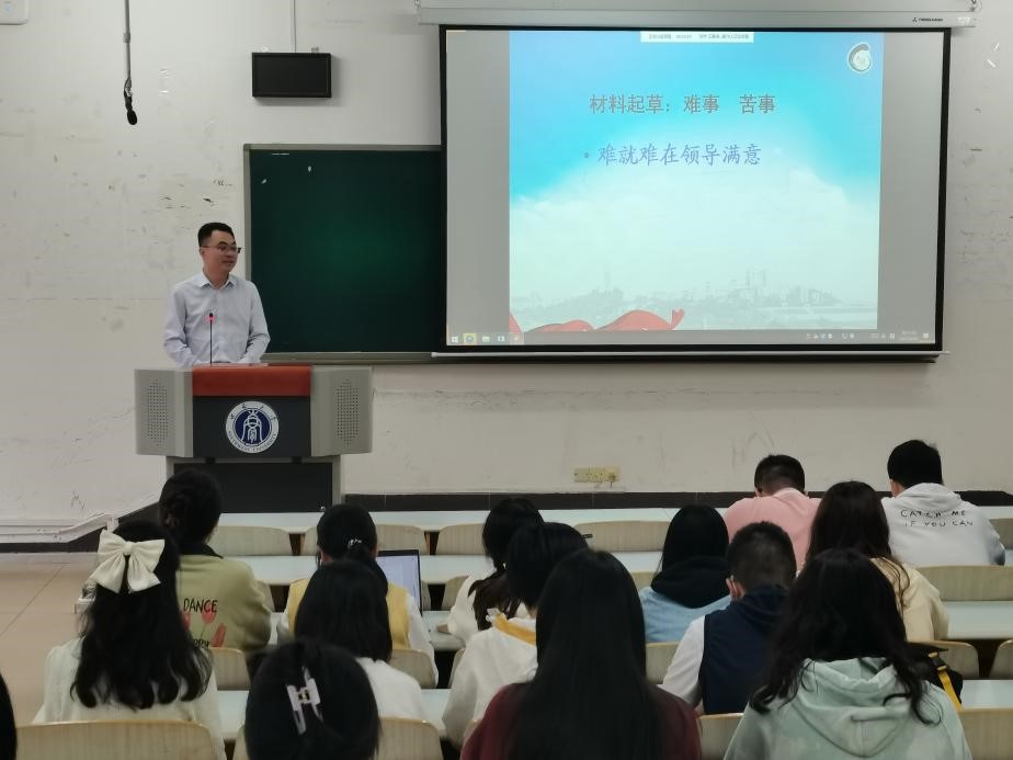 接着,王加维书记以“如何做好文秘工作”为切入点引出文秘工作者的主要职责有三点——精确办文、周全办会和智慧办事,通过基础概念介绍、具体实务操作和自身经验总结三方面展开阐述,深入浅出、鞭辟入里。其中重点谈及公文写作,强调公文写作能力是一名优秀机关干部的必备能力,要培养学习积累的习惯,积极学习会议文件,主动锻炼思维能力,勇于承担公文写作任务,通过实践切实提升公文写作水平。在强调公文写作重要性的同时,王加维书记以实际案例重点剖析了写作中的常见错误,进一步指出公文写作是一件马虎不得的事,要掌握细节,而细节往往是在实践中锻炼出来的,因此,参与实习是一个锻炼自身的好时机,在实际工作中精准认识不足,不断提高综合素质。