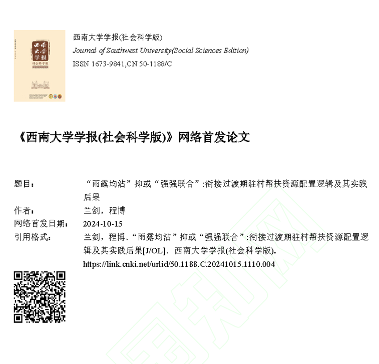 发布时间: 2024-11-01 12:42:20 已阅读:近日,我院社会学与社会工作系教师兰剑团队撰写的《“雨露均沾”抑或“强强联合”:衔接过渡期驻村帮扶资源配置逻辑及其实践后果》一文发表于《yl6809永利官网集团学报(社会科学版)》2024年第5期。文章认为,驻村帮扶是衔接过渡期巩固好脱贫成果、接续推进乡村振兴的重要制度支撑。通过对西部地区两县驻村帮扶工作的调查研究发现,与脱贫攻坚时期更加注重全面帮扶的“雨露均沾”不同,衔接过渡期驻村帮扶资源配置更加注重“强强联合”,在乡村振兴示范点创建的工作机制与目标指引下,一些重点乡村建设项目和资源被少数优势村庄捕获,驻村帮扶强势主客体间存在着理性的“共同谋划”,而部分弱势村庄则深陷于自身基础薄弱和外来资源稀缺的两难境地。驻村帮扶主客体的“强强联合”在一定程度上导致了驻村帮扶主体的行为偏差、村际水平上新的不公平、制度效能低下与低水平管理困境等后果。因此,应加快构建驻村帮扶资源的精准匹配与县域资源统筹共享机制,拓展资源供给渠道并优化驻派结构,以提升帮扶资源配置的公平性和整体帮扶效能。