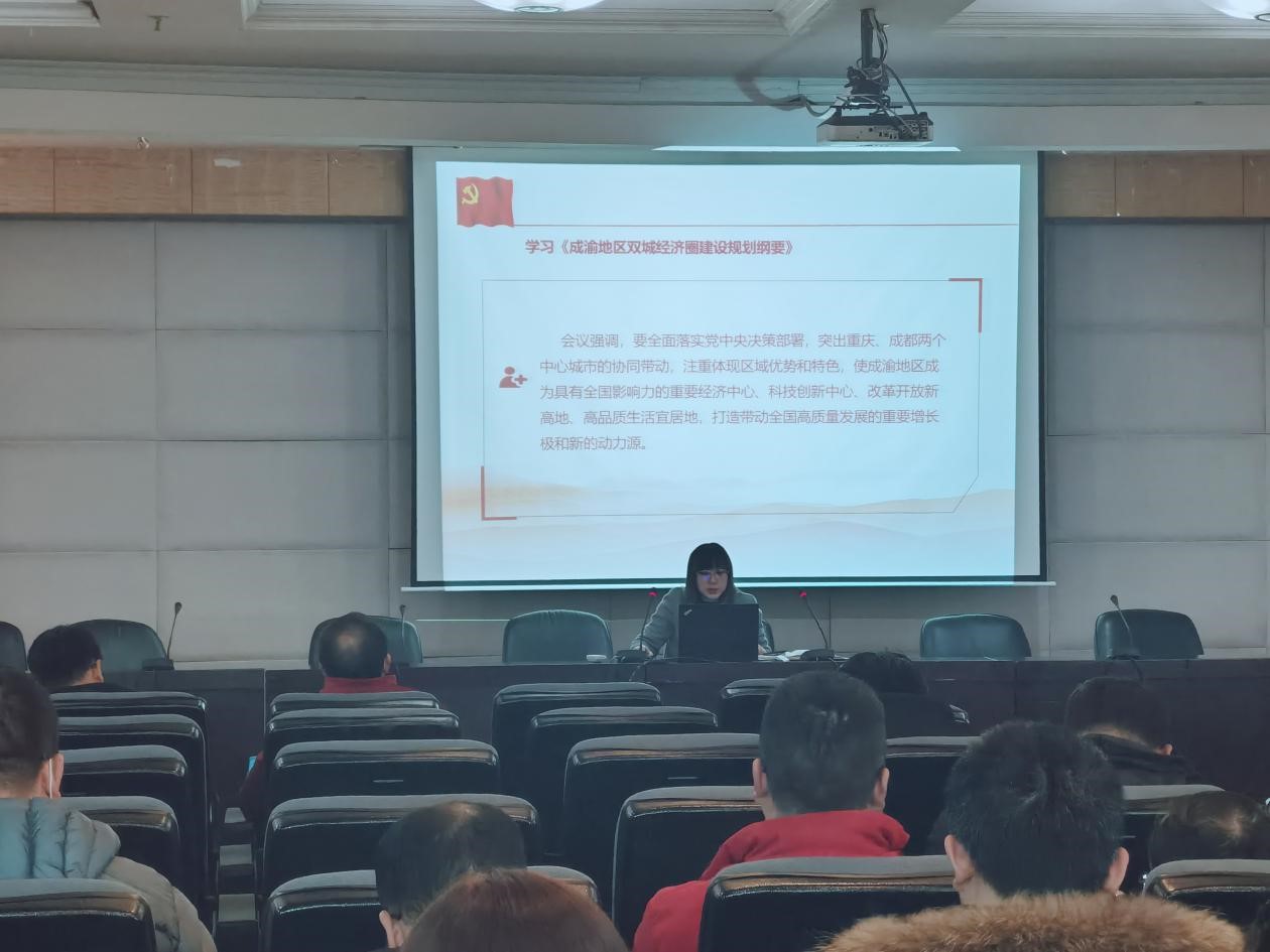接着,全体教职工学习了学习《成渝地区双城经济圈建设规划纲要》。文件强调,要全面落实党中央决策部署,突出重庆、成都两个中心城市的协同带动,注重体现区域优势和特色,使成渝地区成为具有全国影响力的重要经济中心、科技创新中心、改革开放新高地、高品质生活宜居地,打造带动全国高质量发展的重要增长极和新的动力源。成渝双城经济圈建设为我院发展提供了机遇,我院要抓住机遇,加强与成渝各高校展开哲学、社会工作、公共管理等学科交流,同时用科学研究为双城经济圈建设提供智力支持。