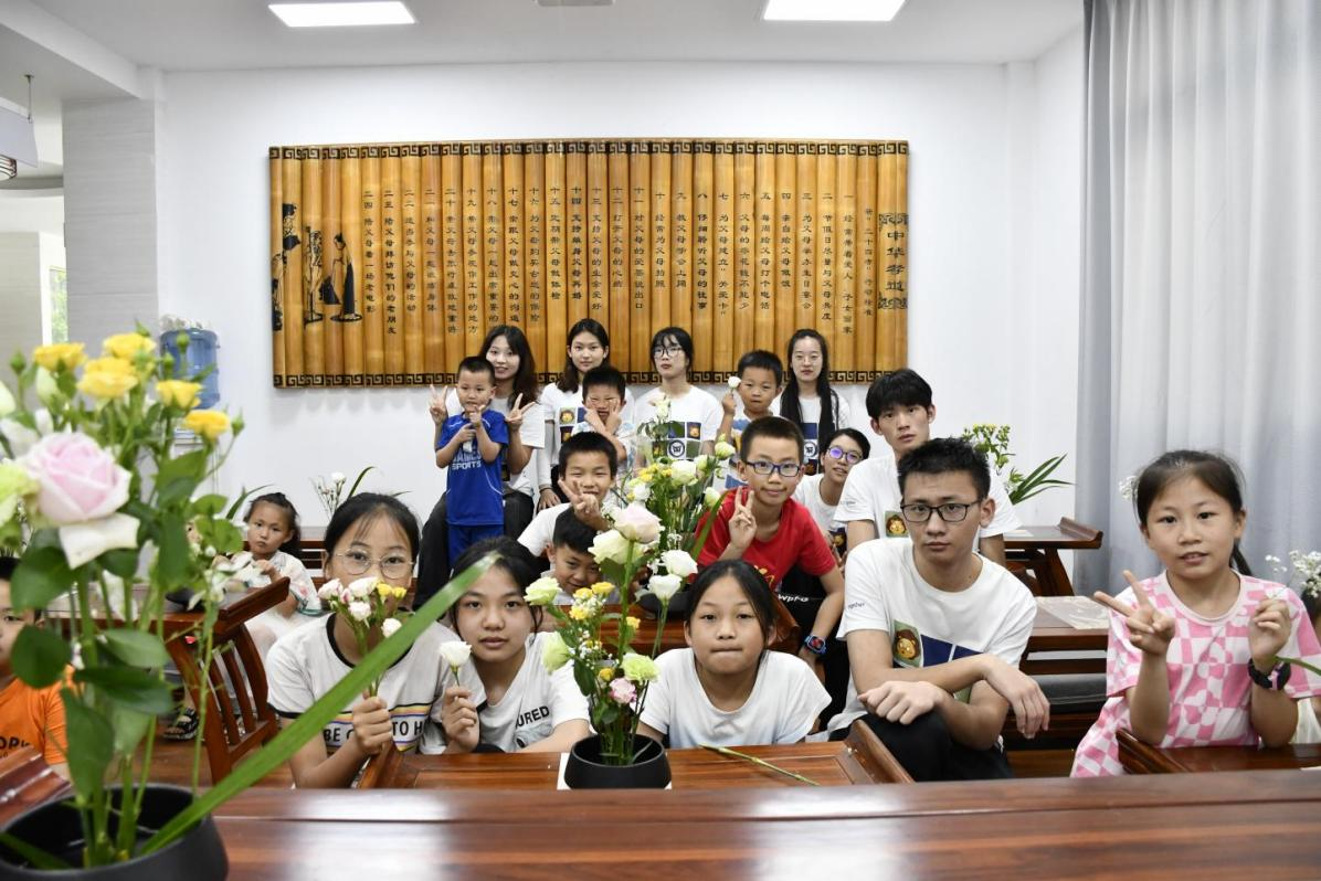 花道是中国传统修身养性、陶冶身心的生活艺术。7月5日下午,实践团成员用通俗易懂的语言对中式插花艺术基本知识、造型、器具、色彩应用以及花的品种等内容进行讲解,并展示了插花的过程并说明需要注意的事项。在实践团哥哥姐姐的指导下,孩子们拿起了桌上的花,兴致盎然地练习插花技艺,修剪花枝、整理花朵、讨论插花位置,探讨插花要领,经过大家的巧手制作,一件件错落有致、造型各异的插花作品诞生了,花香与浓情洋溢在现场的每个角落。