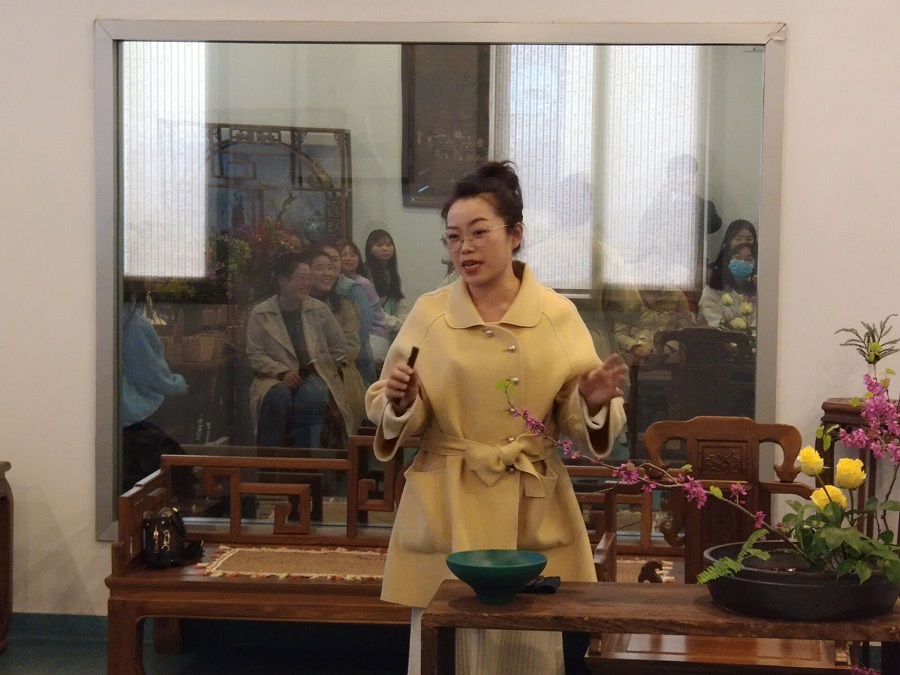 活动伊始,汪林老师向同学们进行了插花艺术的理论分享。她谈到,花文化是一个国家和民族文化的组成部分,是在浓厚的传统文化基础上发展起来的,因此花文化的形成与发展也必然随看国家和民族文化的兴衰而起落。在介绍中国传统插花文化时,她细梳秦汉至明清的插花艺术,就插花的历史起源、技术手法、程序排场、盘盆容器等方面进行了详细讲解,向同学们展示了中式插花艺术背后蕴含的理性意趣和人生哲理——中华民族视花为有灵之物,有情之物,赏花除了常识它那静态的外部形态美之外,还应观察欣赏它动态的生命变化之趣。赏花不仅娱人感官,更撩人情思,能寄以心曲。