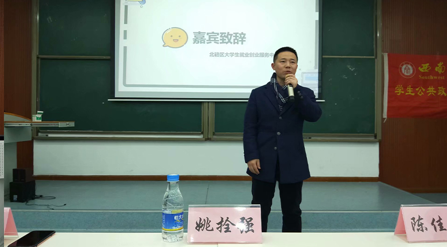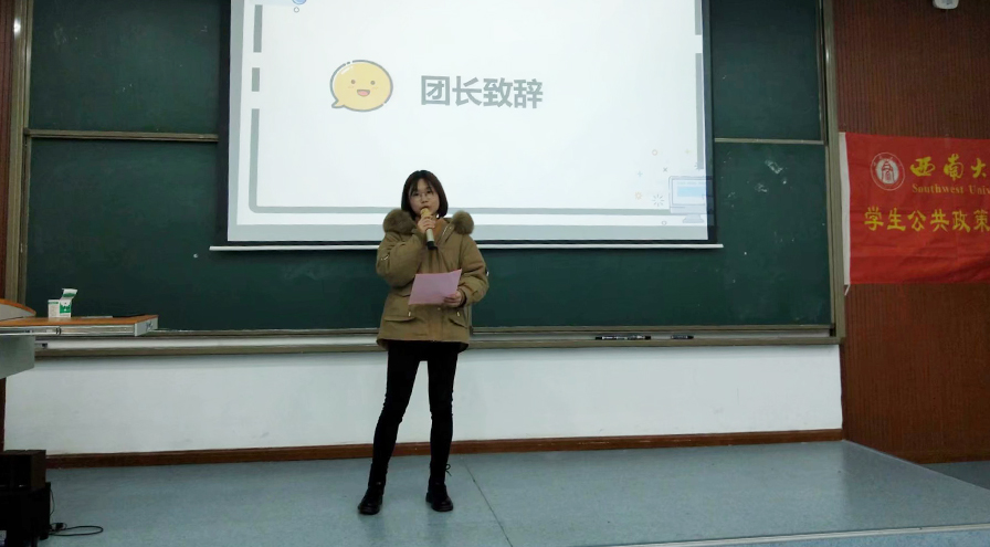在公宣团成员精心准备的开场舞后,主持人宣布本次总结大会正式开始。特邀嘉宾、北碚区大学生就业创业公共服务中心主任姚拴强姚拴强先生首先致辞。他向大家简要介绍了北碚区大学生就业创业公共服务中心的职能,表示期望未来与yl6809永利官网集团公共政策宣讲团共同开展就业创业政策宣讲方面的合作。同学们深受鼓舞,现场不时响起热烈的掌声。随后,第六届公宣团团长曾小倩同学发言,她对第一学期的工作目标、成果、不足进行了梳理,并对第二学期全团继续奋斗提出了展望。