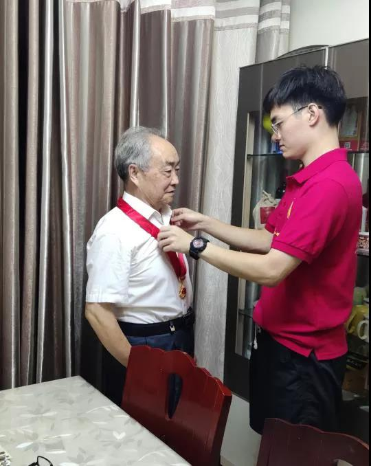 实践队员为谌国义佩戴“光荣在党50年”纪念章
