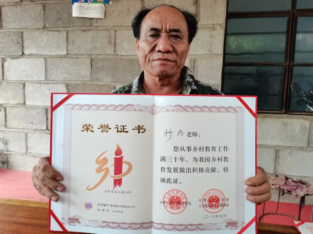 竹内,男,1972年成为一名乡村教师,主要教学对象来自于本村寨的孩子,为了贯彻当时“一师一校”重要政策理念,他作为当时少数乡村教师之一服务于村寨的教学工作。30多年的教学生涯,竹内老师不负使命,每天认真做好教学规划,一有空就跑到学生家里,实时关心学生学习状况,和家长做好沟通。在当时条件很差的情况下,竹内老师说,他每个月7块钱的工资,没想着往家里买点什么东西,全是想着给学生买点书。2003年,竹内老师光荣退休,可他每天都在关注着中国教育的发展,关心着村寨孩子的教育情况。